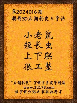 今日3d太湖字谜总汇,3d之家为您详细解答2024016期3d太湖字谜,并汇总多位专家精解太湖字谜供参考。