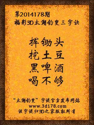 2014年福彩3d第178期太湖钓叟字谜:挥锄头,挖土豆,黑啤酒,喝不够