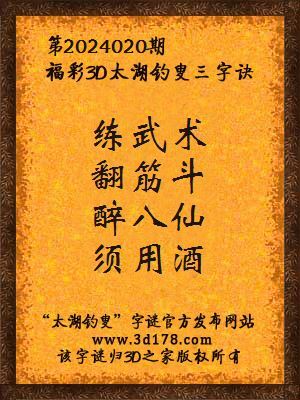 福彩第2024020期3d太湖字谜:练武术,翻筋斗,醉八仙,须用酒