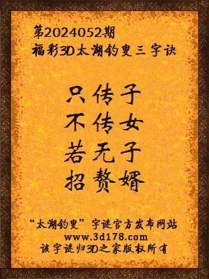 福彩第2024052期3d太湖字谜:只传子,不传女,若无子,招赘婿