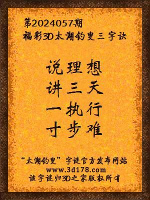 福彩第2024057期3d太湖字谜:说理想,讲三天,一执行,寸步难