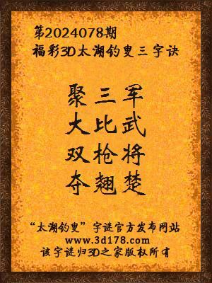 福彩第2024078期3d太湖字谜:聚三军,大比武,双枪将,夺翘楚