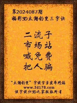 福彩第2024087期3d太湖字谜:二流子,市场站,喊免费,把人骗