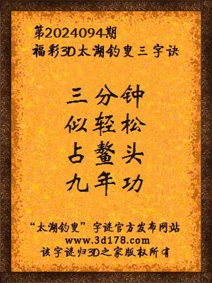 福彩第2024094期3d太湖字谜:三分钟,似轻松,占鳌头,九年功
