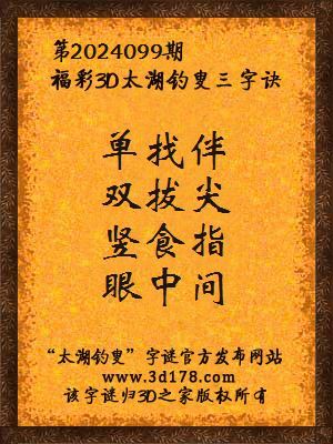 福彩第2024099期3d太湖字谜:单找伴,双拔尖,竖食指,眼中间