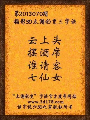 福彩3D第13070期太湖字谜:云上头,摆酒席,谁请客?七仙女