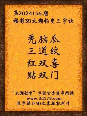 福彩第2024156期3d太湖字谜:秃脑瓜,三道纹,红双喜,贴双门