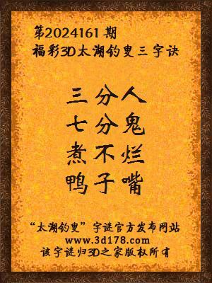 福彩第2024161期3d太湖字谜:三分人,七分鬼,煮不烂,鸭子嘴