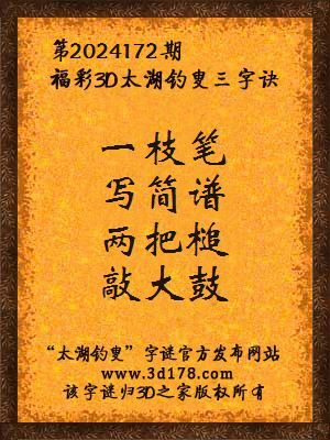 福彩第2024172期3d太湖字谜:一枝笔,写简谱,两把槌,敲大鼓