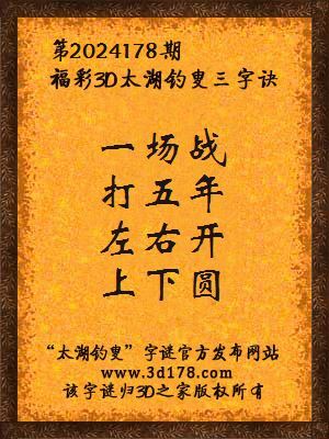福彩第2024178期3d太湖字谜:一场战,打五年,左右开,上下圆