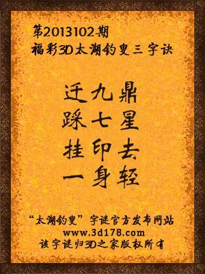 福彩3D第13102期太湖字谜:迁九鼎,踩七星,挂印去,一身轻