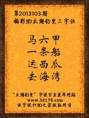 福彩3D第13103期太湖字谜:马六甲,一条船,运西瓜,去海湾