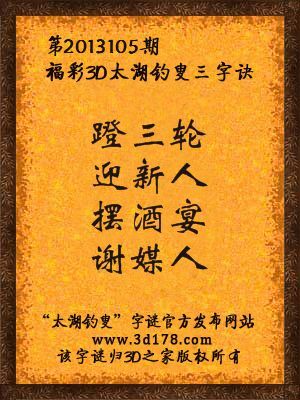 福彩3D第13105期太湖字谜:蹬三轮,迎新人,摆酒宴,谢媒人