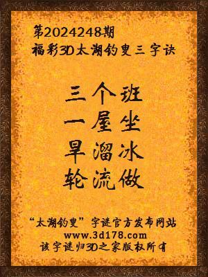 福彩第2024248期3d太湖字谜:三个班,一屋坐,旱溜冰,轮流做