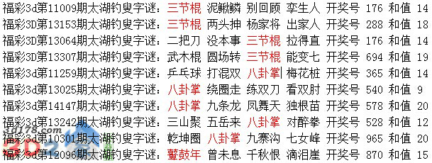 福彩3d第14147期太湖钓叟字谜:八卦掌 九条龙 凤舞天 独根苗 开奖号 578 和值 20