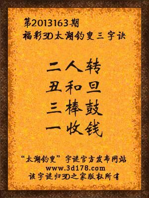 福彩3D第13163期太湖字谜:二人转,丑和旦,三棒鼓,一收钱