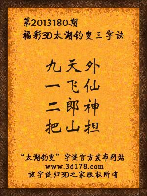 福彩3D第13180期太湖字谜:九天外,一飞仙,二郎神,把山担