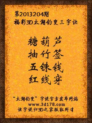 福彩3D第13204期太湖字谜:糖葫芦,抽竹签,五铢钱,红线穿