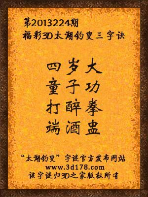 福彩3D第13224期太湖字谜:四岁大,童子功,打醉拳,端酒盅