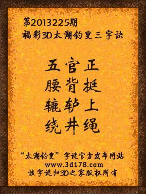 福彩3D第13225期太湖字谜:五官正,腰背挺,辘轳上,绕井绳