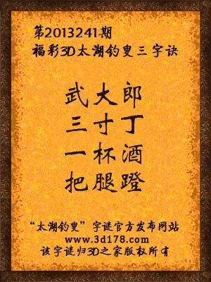 福彩3D第13241期太湖字谜:武大郎,三寸丁,一杯酒,把腿蹬