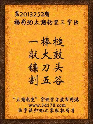 福彩3D第13252期太湖字谜:一棒槌,敲大鼓,镰刀头,割五谷