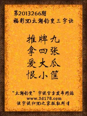 福彩3D第13266期太湖字谜:推牌九,拿四张,爱大瓜,恨小筐
