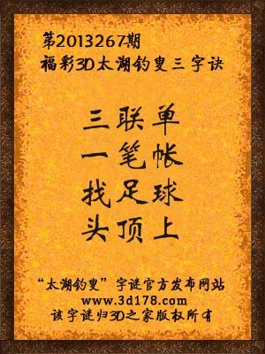 福彩3D第13267期太湖字谜:三联单,一笔帐,找足球,头顶上