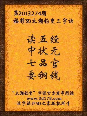 福彩3D第13274期太湖字谜:读五经,中状元,七品官,要铜钱