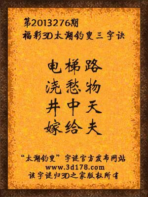 福彩3D第13276期太湖字谜:电梯路,浇愁物,井中天,嫁给夫