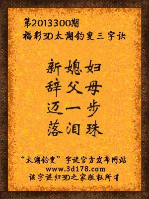 福彩3D第13300期太湖字谜:新媳妇,辞父母,迈一步,落泪珠