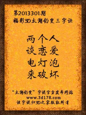 福彩3D第13301期太湖字谜:两个人,谈恋爱,电灯泡,来破坏