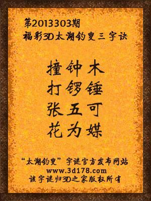 福彩3D第13303期太湖字谜:撞钟木,打锣锤,张五可,花为媒