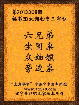 福彩3D第13308期太湖字谜:六兄弟,坐圆桌,众妯娌,旁边桌