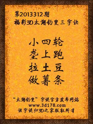 福彩3D第13312期太湖字谜:小四轮,垄上跑,拉土豆,做薯条