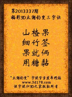 福彩3D第13337期太湖字谜:山楂果,细竹签,果就俩,用糖黏