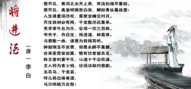 本期太湖字谜讲的是买烧酒喝,送老伴八大件的东西的故事。从酒字可引申出李白《将进酒》。《将进酒》原是汉乐府短箫铙歌的曲调,属汉乐府《鼓吹曲·铙歌》旧题。题目意译即“劝酒歌”。唐代李白沿用乐府古体写的《将进酒》,影响最大。李白在《将进酒》一诗中表达了对怀才不遇的感叹,又抱着乐观、通达的情怀,也流露了人生几何当及时行乐的消极情绪。但全诗气势豪迈,感情奔放,语言流畅,具有很强的感染力,李白“借题发挥”借酒浇愁,抒发了自己的愤激情绪。