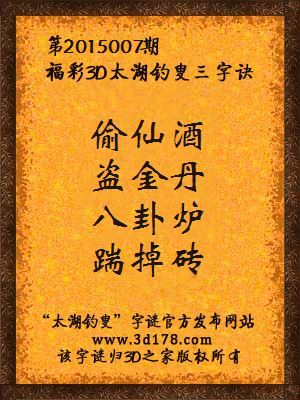 2015年福彩3d第007太湖钓叟字谜:偷仙酒,盗金丹,八卦炉,踹掉砖。