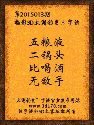 3D第2015013期太湖字谜:五粮液,二锅头,比喝酒,无敌手