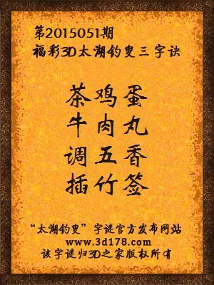3D第2015051期太湖字谜:茶鸡蛋,牛肉丸,调五香,插竹签
