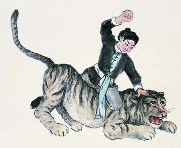 东邻肉:这只老虎被打了之后,被人拿到东边卖老虎肉,东字笔画有5画。解:5;