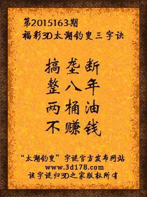 3D第2015163期太湖字谜:搞垄断,整八年,两桶油,不赚钱