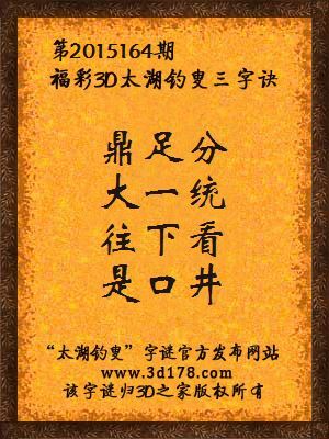 3D第2015164期太湖字谜:鼎足分,大一统,往下看,是口井