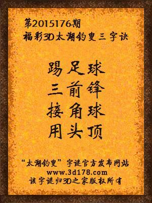 福彩3D第2015176期太湖字谜:踢足球,三前锋,接角球,用头顶