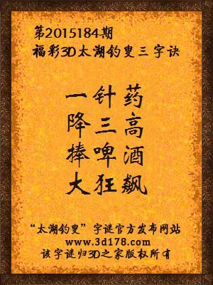 福彩3D第2015184期太湖字谜:一针药,降三高,捧啤酒,大狂飙
