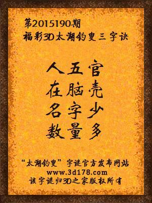 福彩3D第2015190期太湖字谜:人五官,在脑壳,名字少,数量多