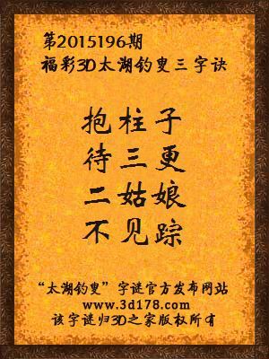 福彩3D第2015196期太湖字谜:抱柱子,待三更,二姑娘,不见踪