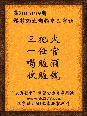 福彩3D第2015199期太湖字谜:三把火,一任官,喝赃酒,收赃钱
