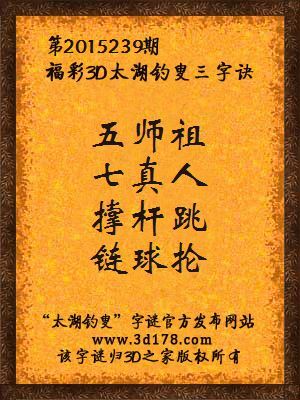 福彩3D第2015239期太湖字谜:五师祖,七真人,撑杆跳,链球抡