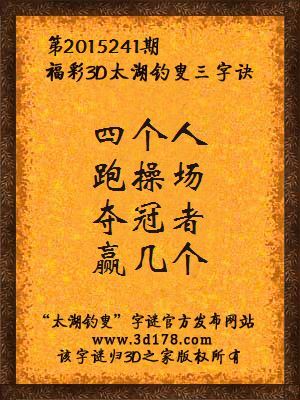 福彩3D第2015241期太湖字谜:四个人,跑操场,夺冠者,赢几个